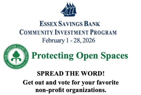 The Essex Savings Bank’s Community Investment Program donates up to 10% of its after-tax net income to many worthy non-profit organizations in the Lower CT River Valley region. The Chester Land Trust has been for years one of the fortunate recipients of these funds. Last year, CLT received $1,019.00 from this program.